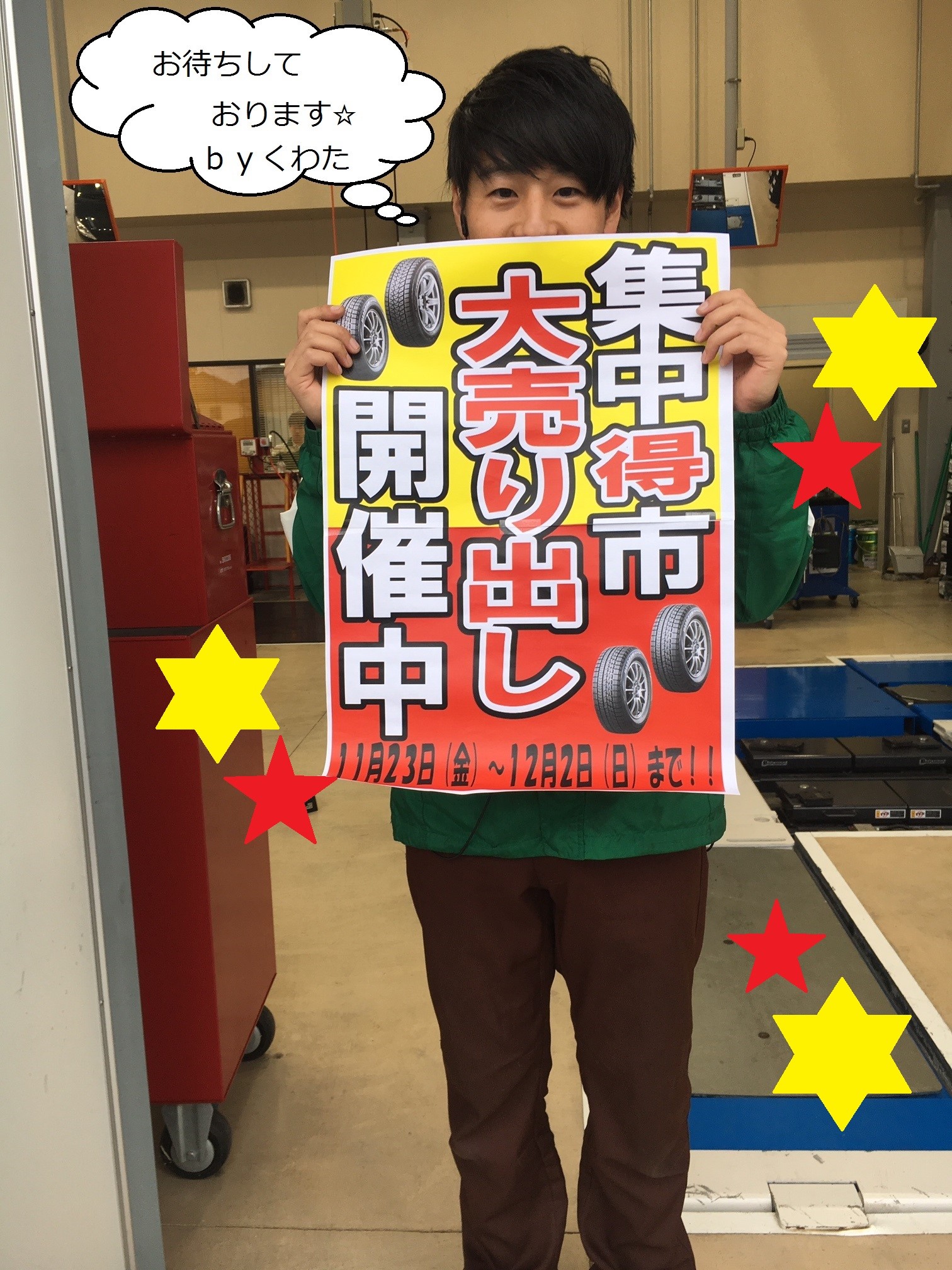 ☆集中得市開催中☆ ポスト 2018年11月23日 こんにちは~!! タイヤ館行橋店です(๑˃̵ᴗ˂̵)/ いよいよ今日から集中得市開催です♪ 欲しかったタイヤ・ホイール等 この機会に是非!! お見積りだけでもOK( ˘͈ ᵕ ˘͈ ) お気軽にお立ち寄りください♪ 担当:江﨑