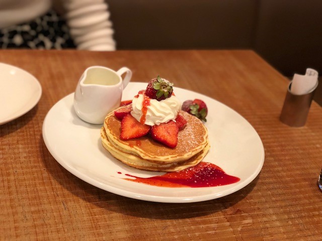 先日、買い物ついでに博多駅のキャンベル・アーリーで苺のパンケーキ食いました。