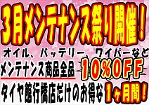 こんにちはタイヤ館行橋店の池見です! 今日から3月の始まりですね~! 2018年もあっという間に終りそうな勢いです(ノ゚ο゚)ノ そんな中、 今月のタイヤ館行橋店のイベントは、、、 メンテナンス商品(オイル、バッテリー、ワイパー、エアコンフィルターなど) 通常価格より10%OFFでご提供させて...