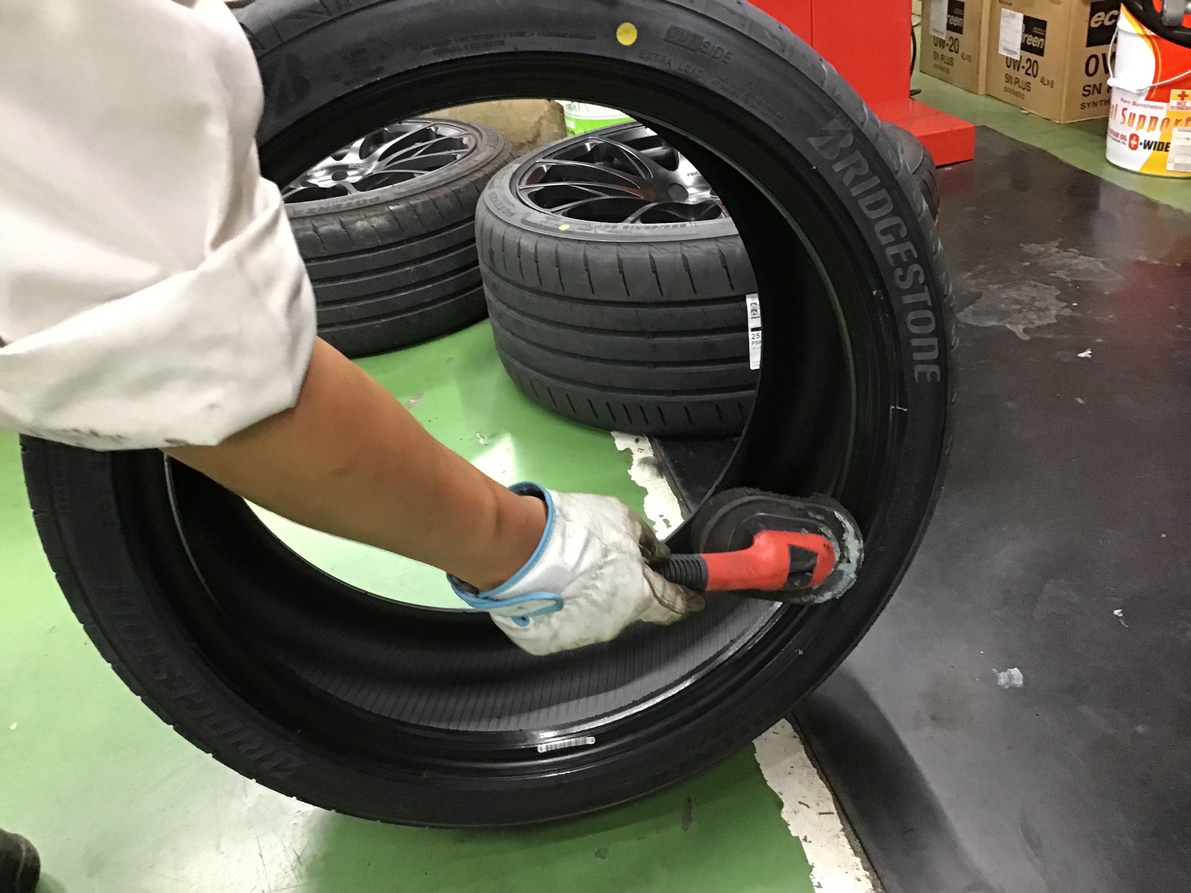 ホイールとタイヤの間に石鹸水を吹きかけます