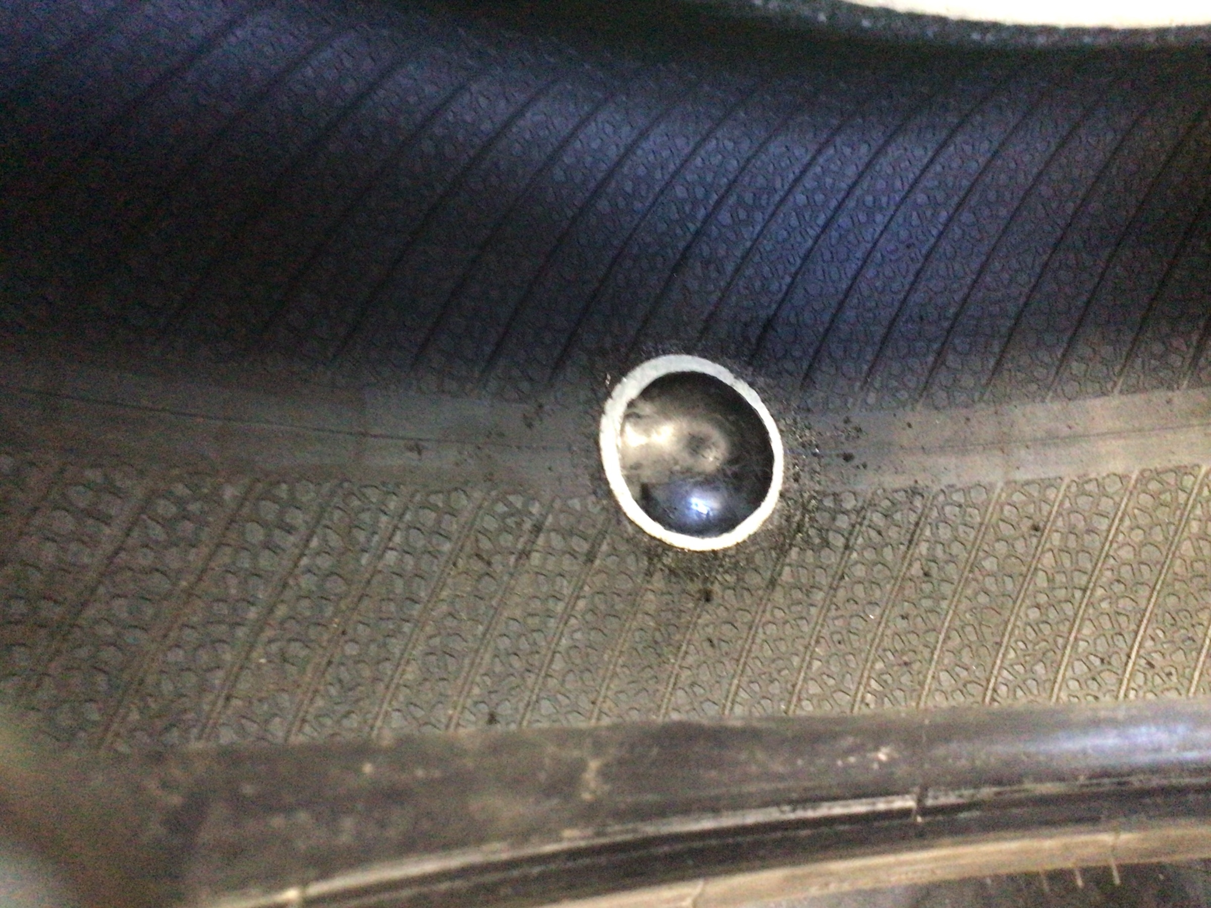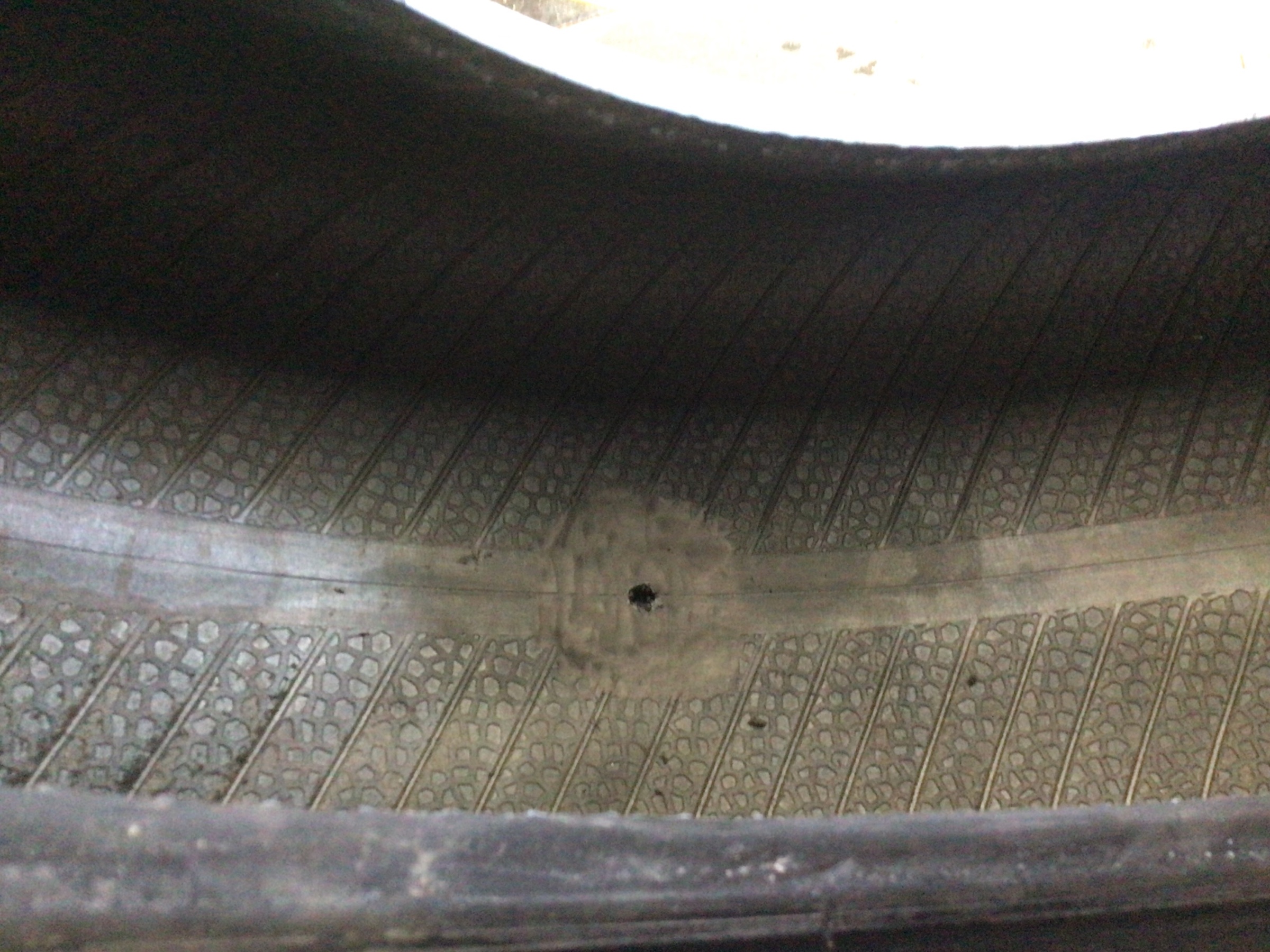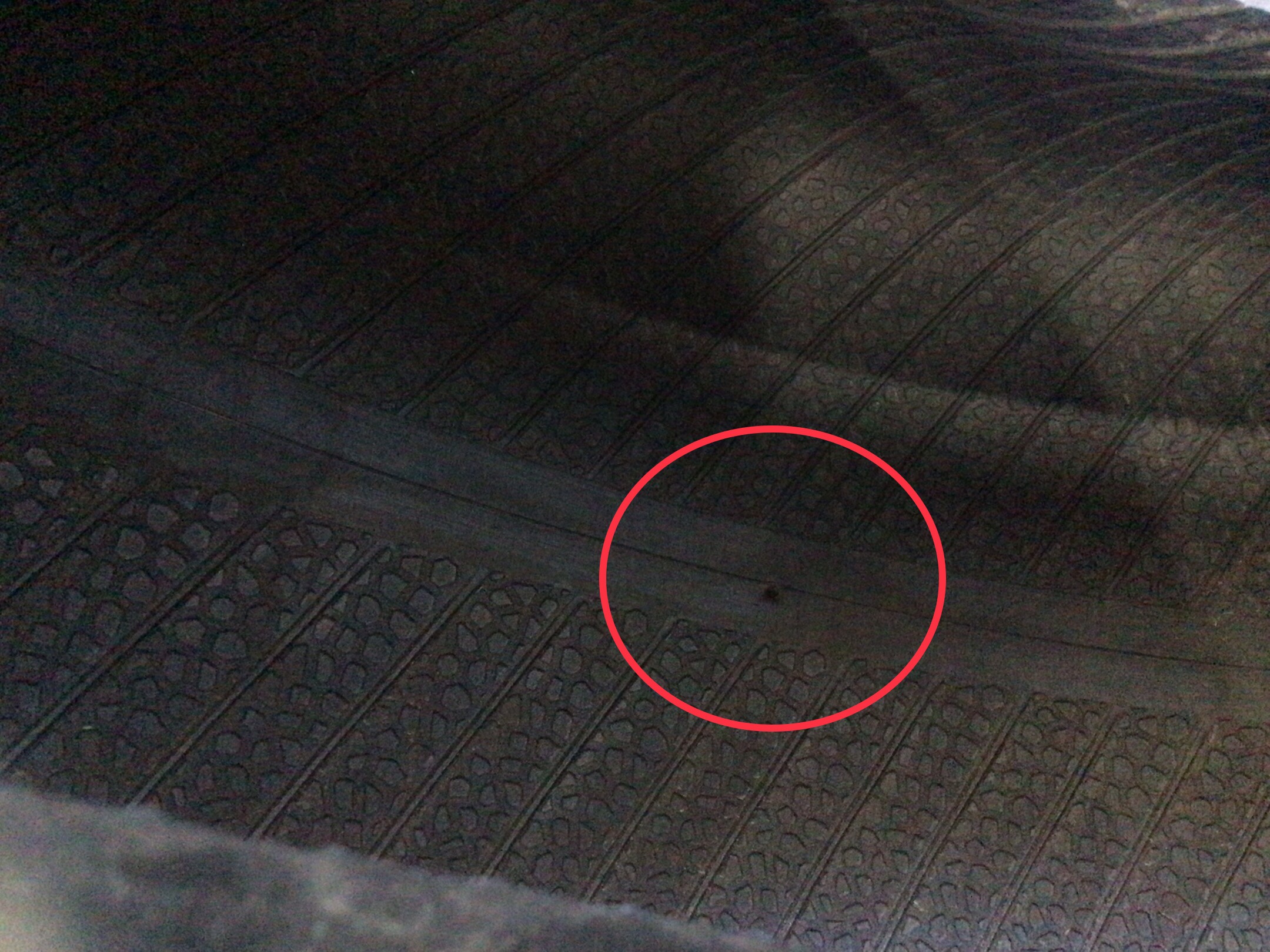 タイヤを外して裏からチェックすると釘を発見!こちらが原因になりますね。