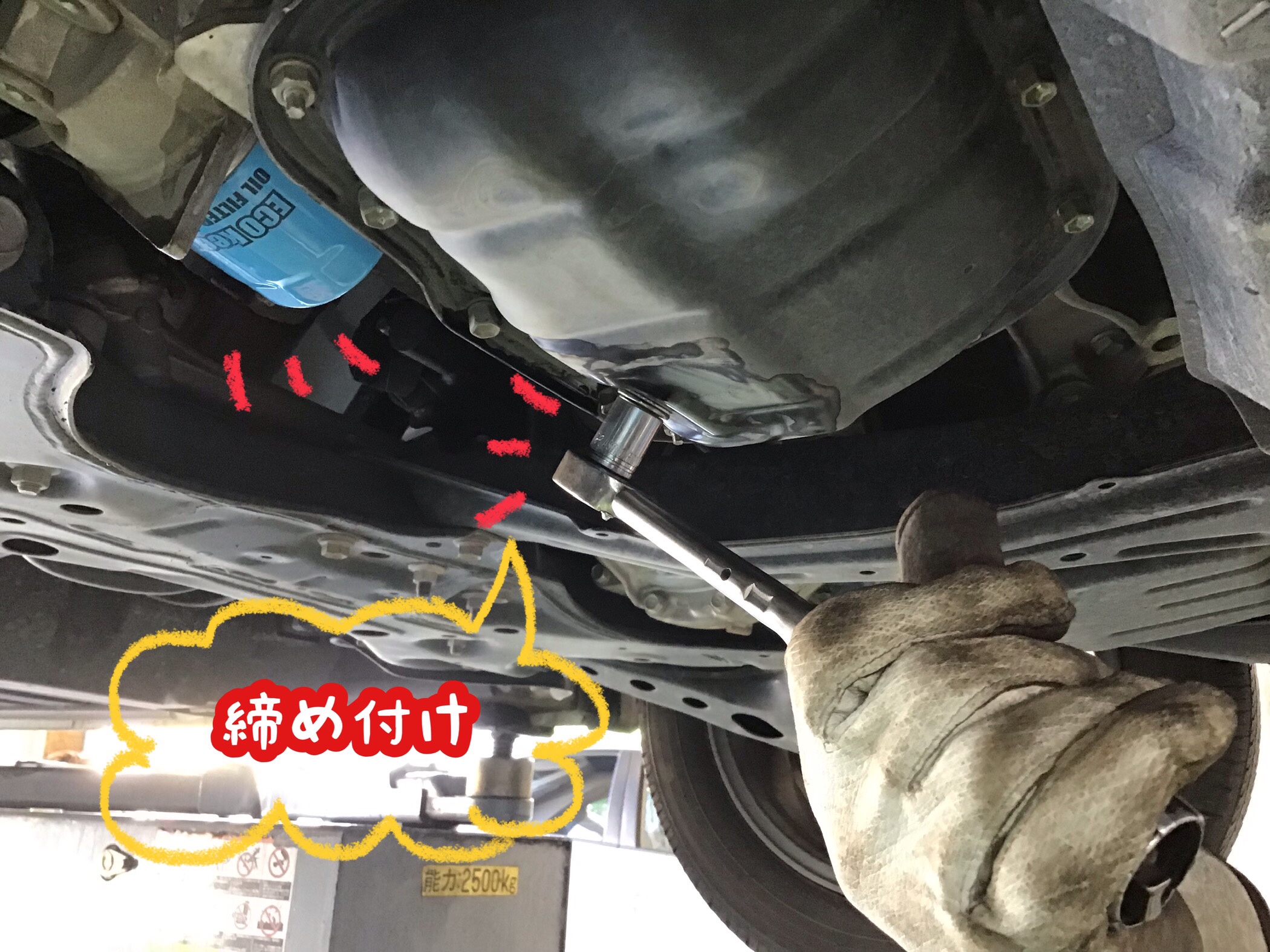 エンジン下のオイルパンにあるドレンボルトを外してオイルを排出します。