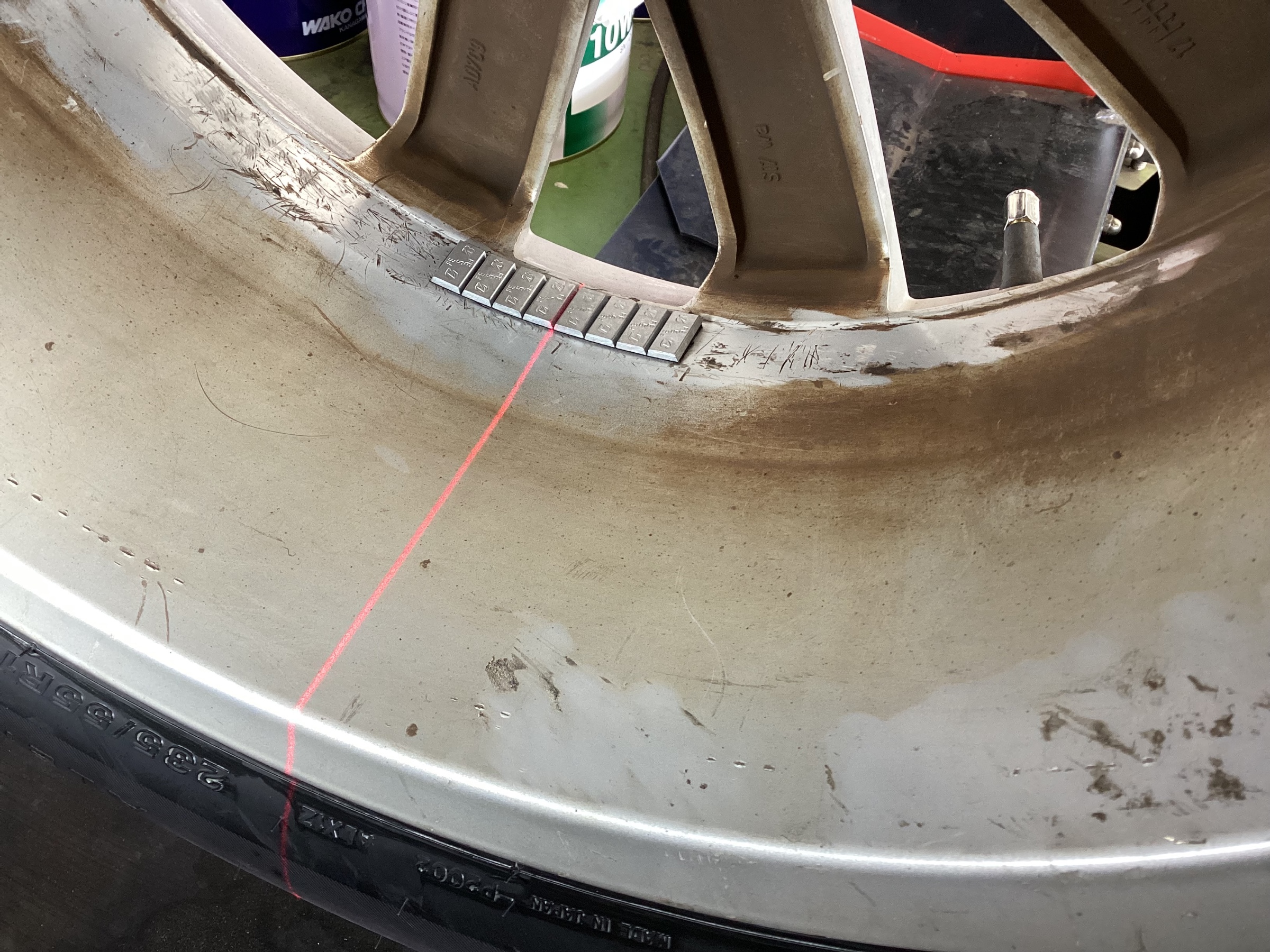 またホイールバランサーのレーザー光線が