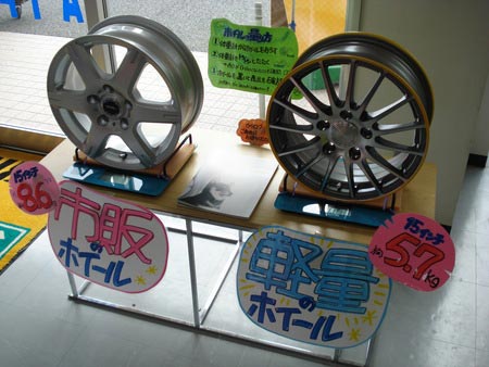 ちなみに当店に現在あるホイールの中で一番軽いエコホイールは15インチで5.7キロです。1台分で11.6キロも違っちゃいますよ☆