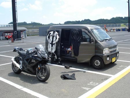 パドックでパンツ一丁になり車の影で風に当たる。