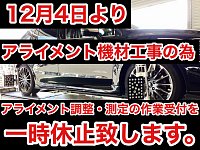 日頃より当店をご愛顧頂き誠にありがとうございます。 お客様へお知らせですm(__)m 12月4日より当店のアライメント機材の工事のため アライメント測定・調整作業をお受けすることができません。 工事が終了時点で受付を再開させていただきますので、ご予約の際はご注意いただけますようお願い申し上...