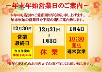 セールもやってます。こんにちは、塙です 歳末決算セールは30日(木)まで開催します ということで年末年始の休業日等のご案内です 画像の通りにはなりますが 12月28日(火) 通常営業 12月29日(水) 定休日 12月30日(木) 年内営業最終日で当日作業は事前予約のみ 12月31日(金)~1月3日(月)まで休業 1月4...