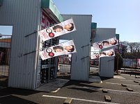 こんにちは! 突然ですが、見てください!! 新しい設置の仕方ですよね〜⁉︎朝からスタッフが取り付けてました^_^ バイパスからご入店いただく際に目立つと思います! 風の強い日には撤去させていただくと思いますが、 ご来店の際にはこののぼりを目印にお越しください\( ˆoˆ )/