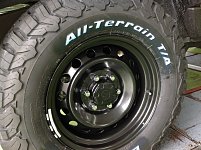 FJクルーザーのお客様がご注文頂いていました、ホイールとタイヤの組み付けにきていただきました! 元はアルミでしたが、黒の鉄チンホイールとグッドリッチの組み合わせです。 引き締まってかっこいいですね! 交換後、アライメントも測定修正しました。新車から1500キロほどしか走行しておらず足回...