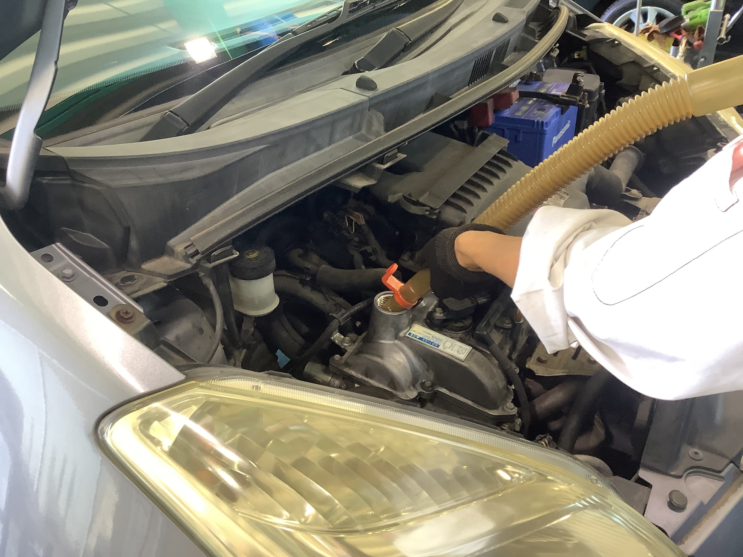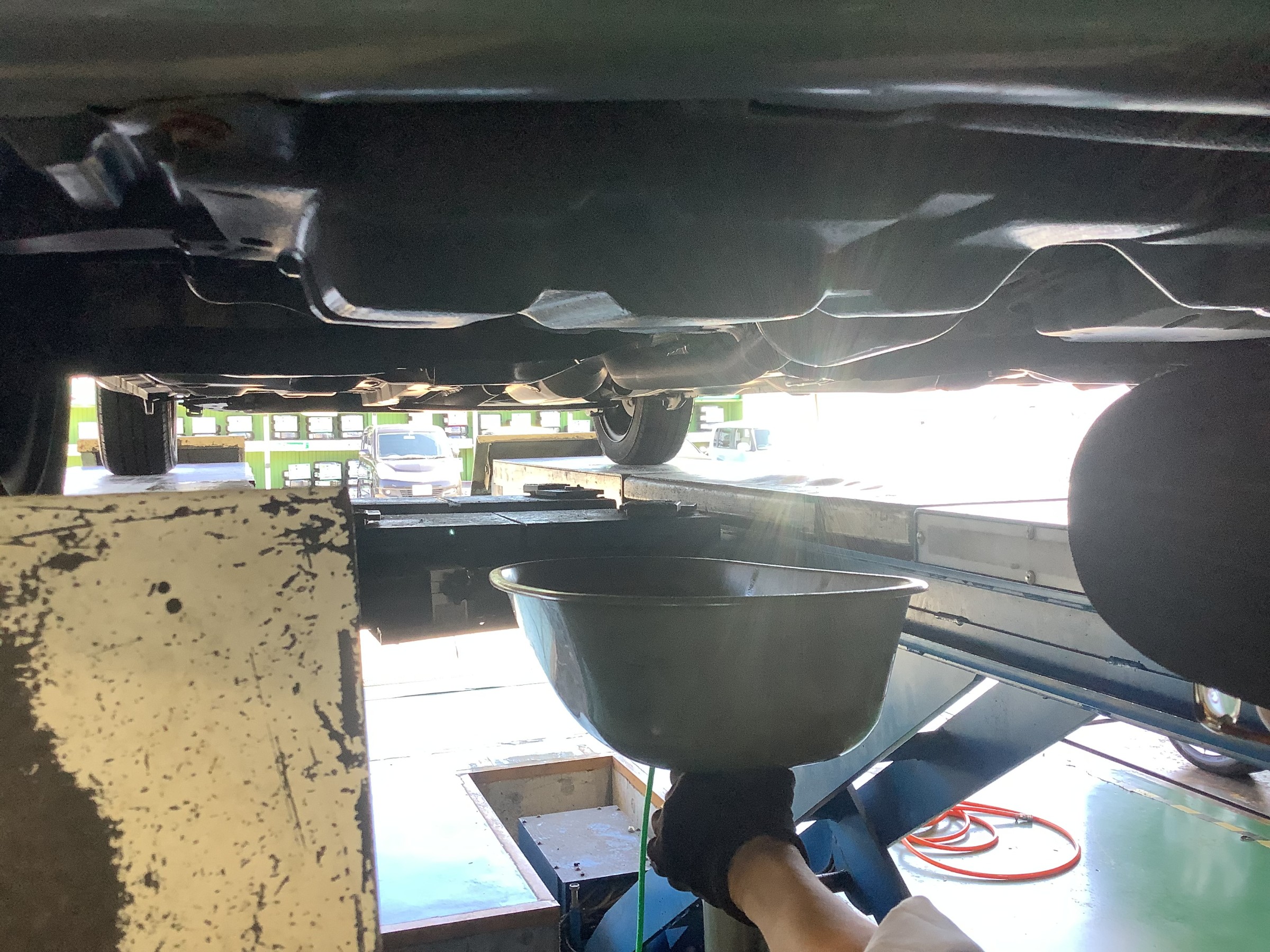オイルを抜き終わったら車を降ろし、新しいエンジンオイルを入れていきます!!