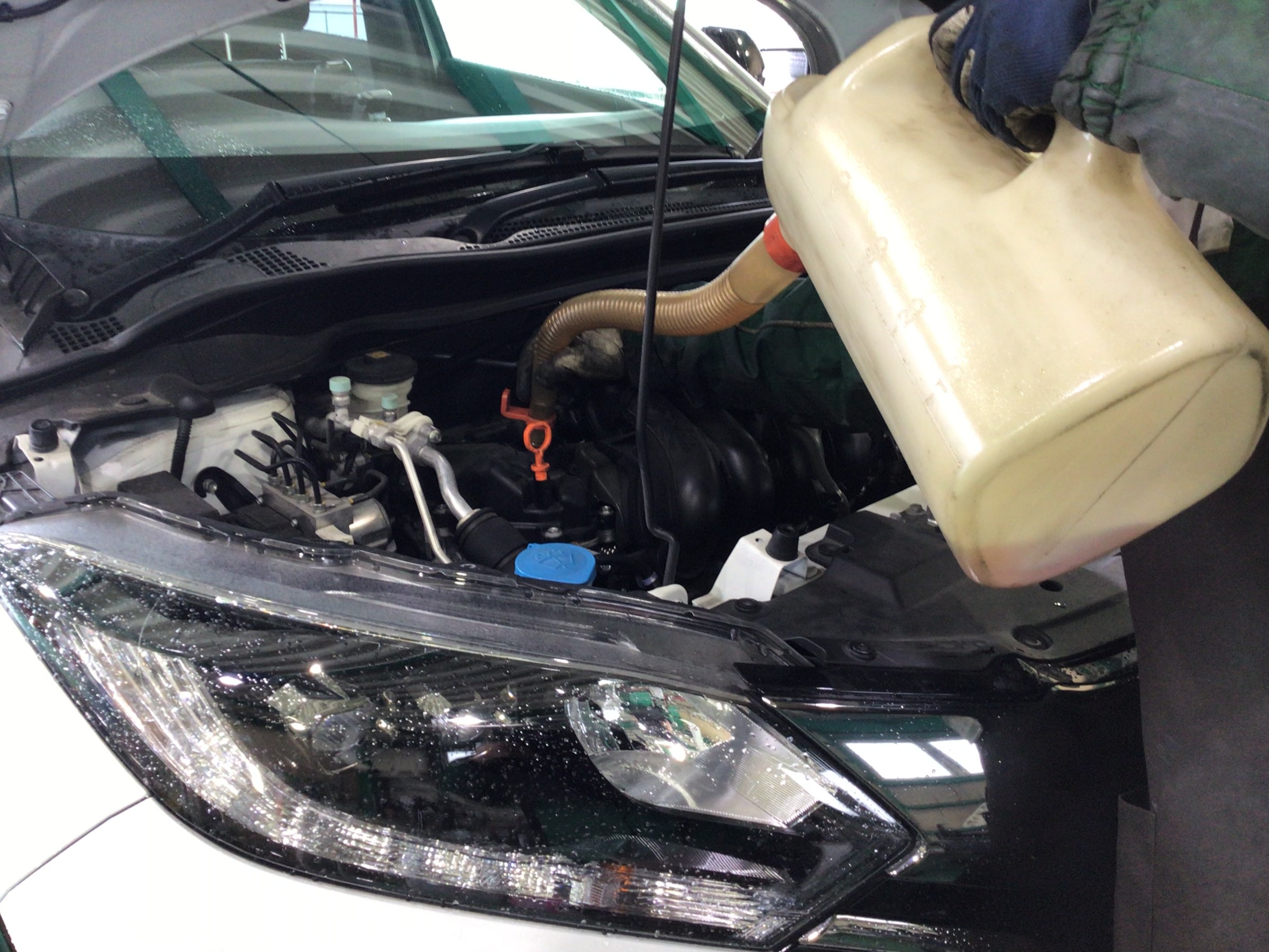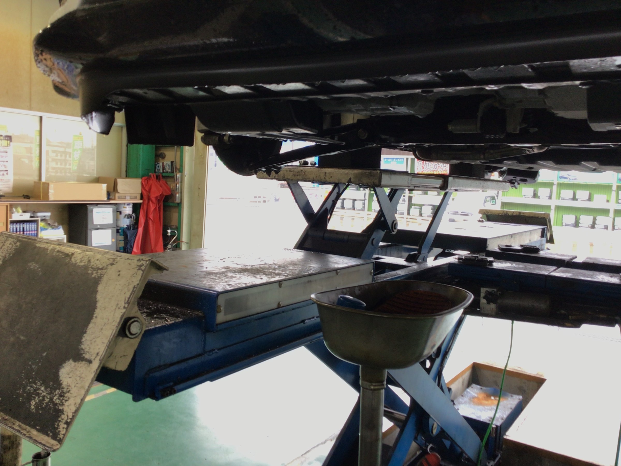 オイルを抜き終わったら車を降ろし、新しいエンジンオイルを入れていきます!!
