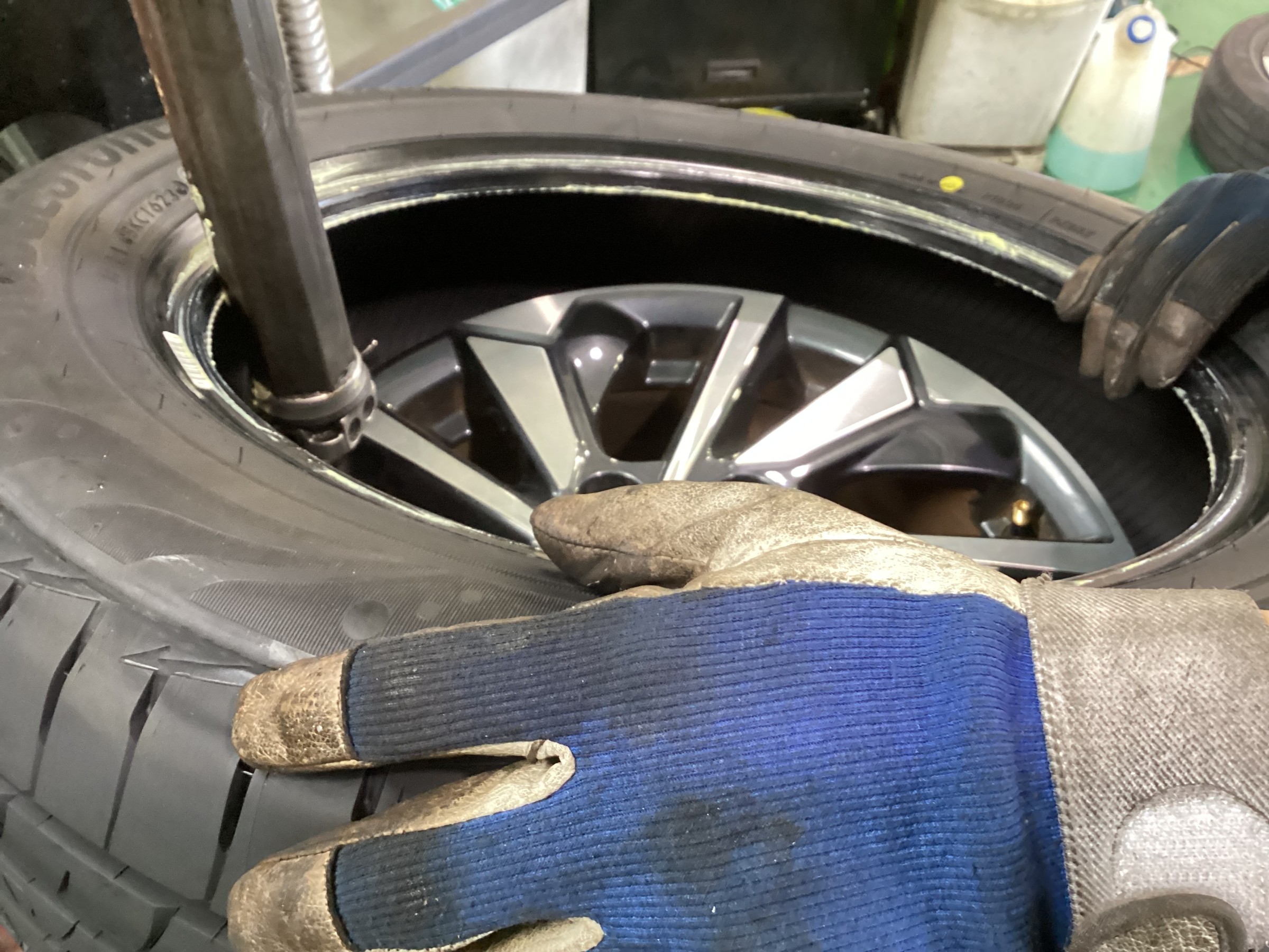古いタイヤを専用機械で外し新しいタイヤを組み付けて、バランスをとっていきます。