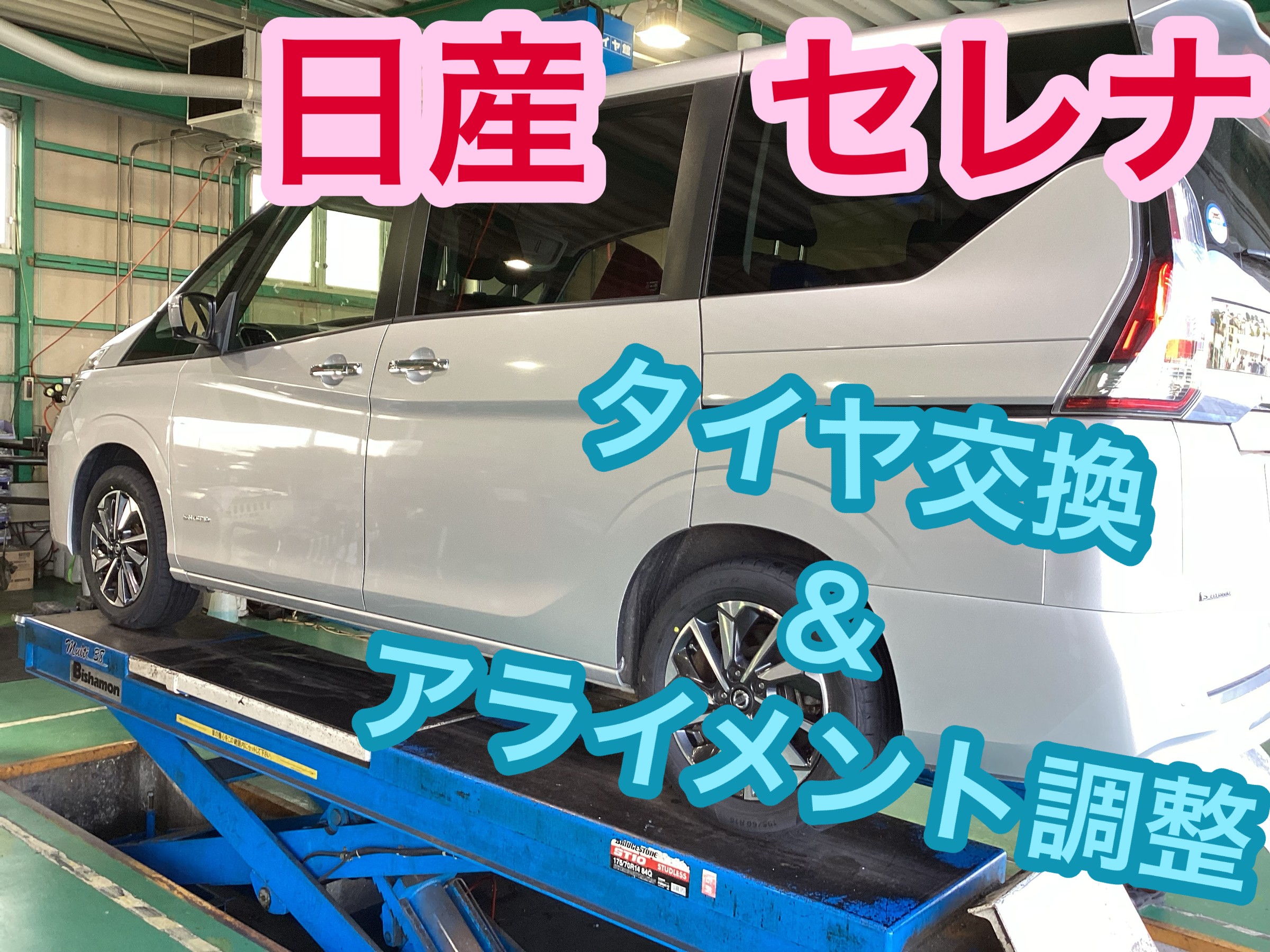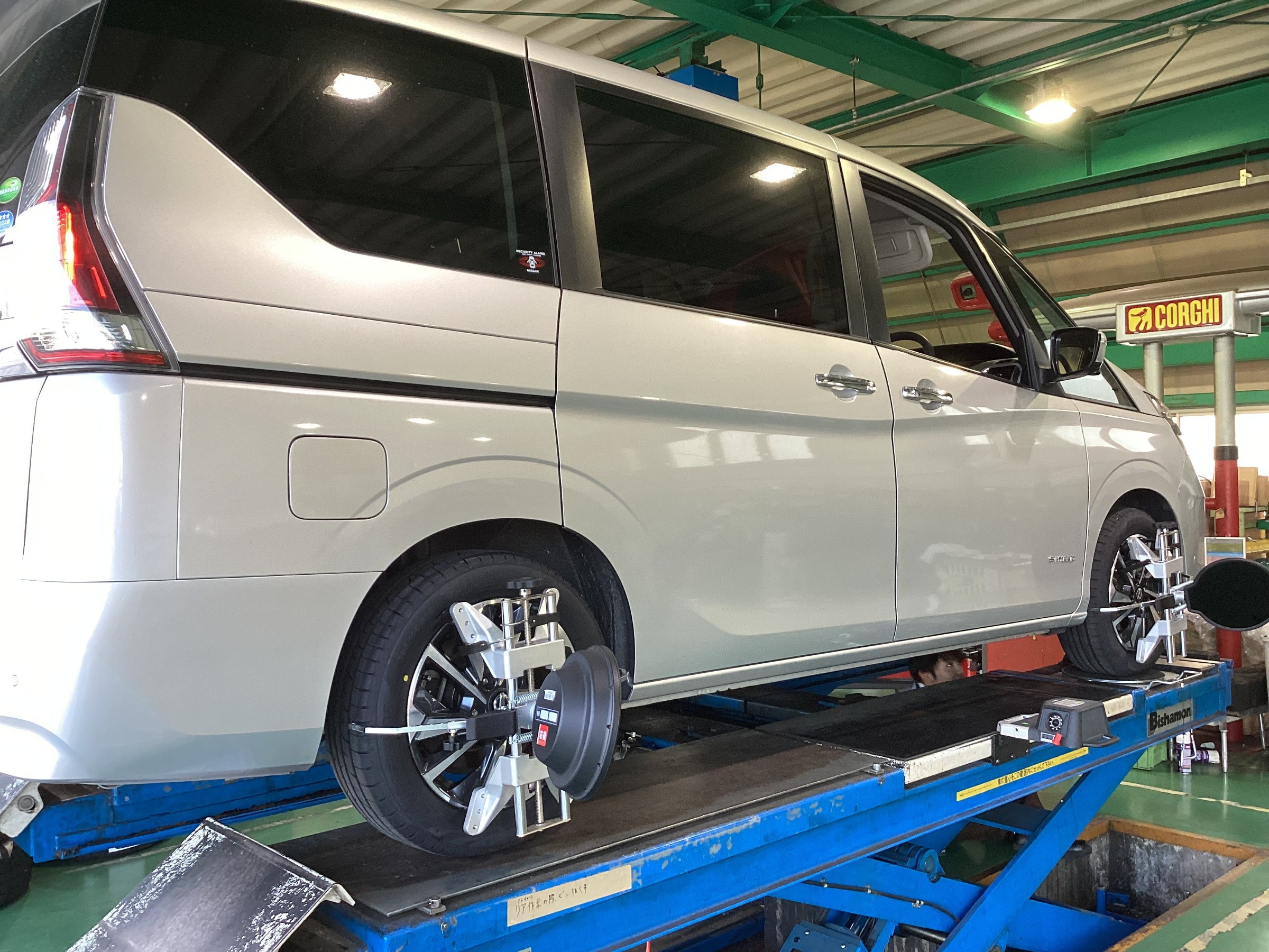 本日は、日産 セレナのタイヤ交換&アライメント調整作業のご紹介です!
