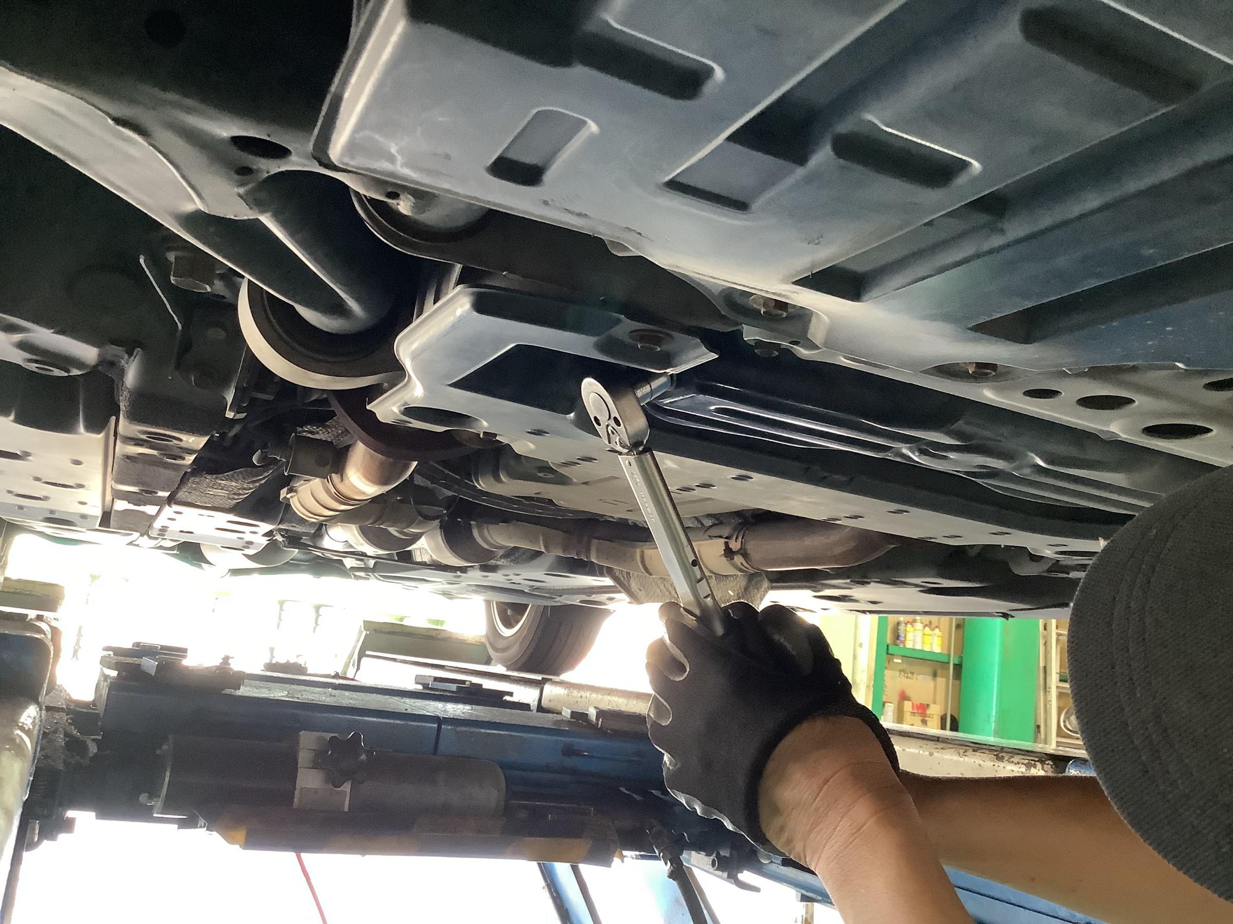 車をジャッキアップし、下からオイルを抜いていきます。