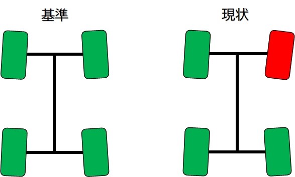 右の前がトーアウト(タイヤの先が外に開いています)。