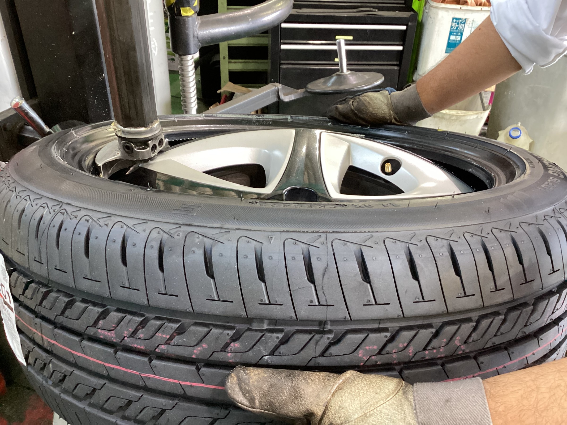 古いタイヤを専用機械で外し新しいタイヤを組み付けて、バランスをとっていきます。