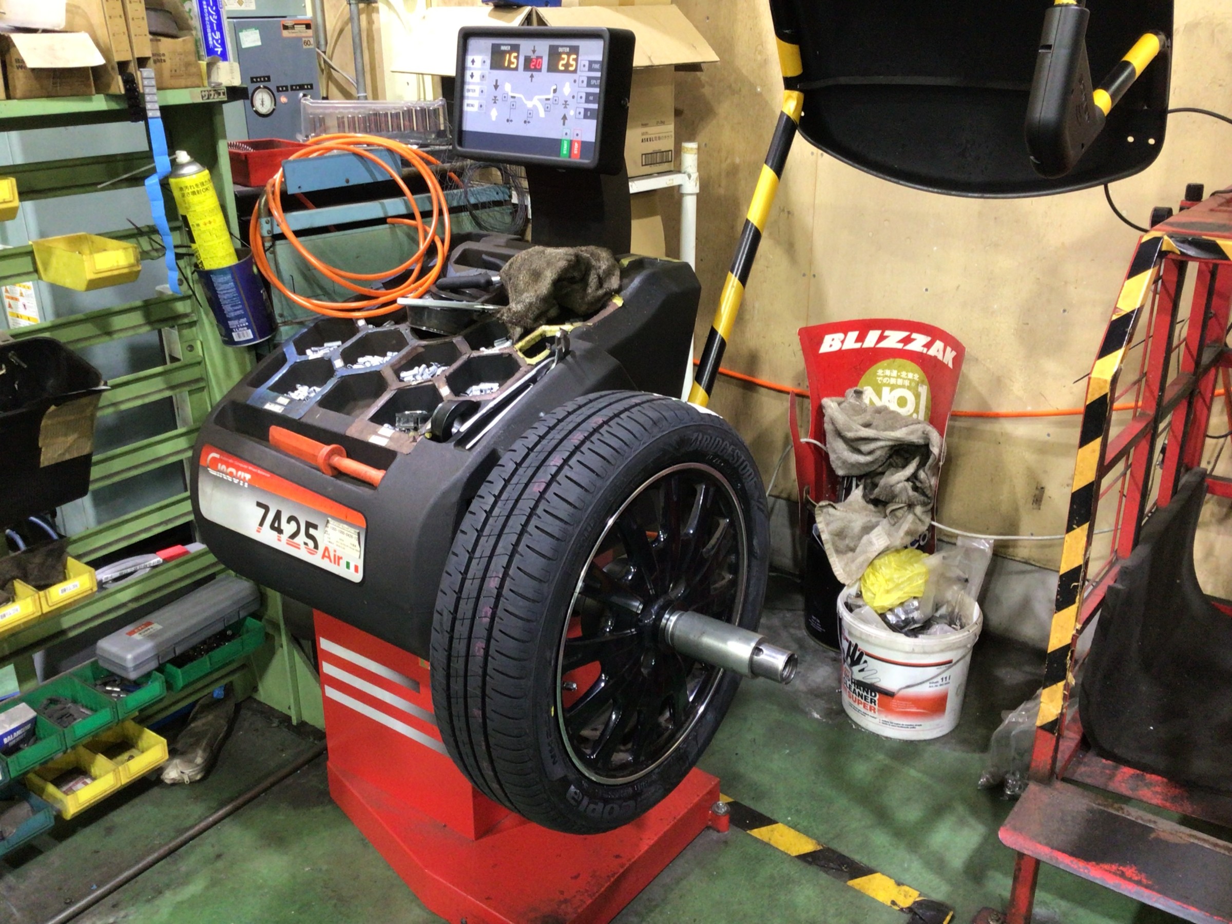 空気・窒素ガスを充填した後はホイールバランスをはかっていきます。