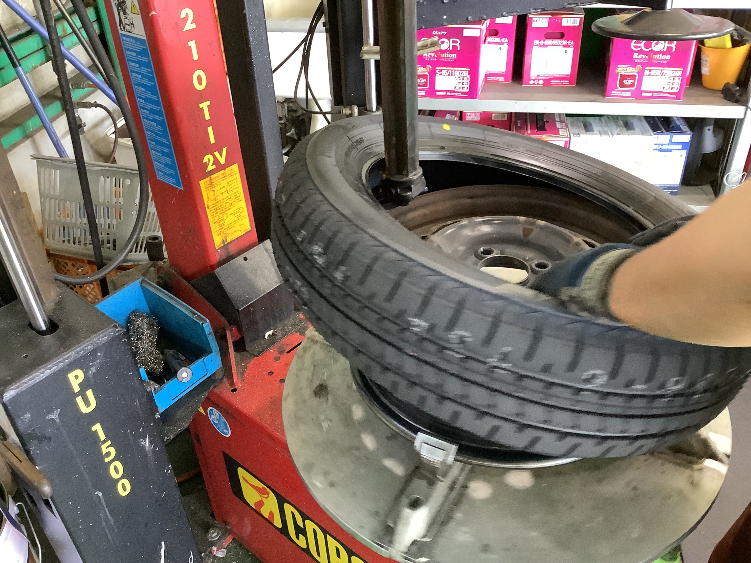 古いタイヤを専用機械で外し新しいタイヤを組み付けて、