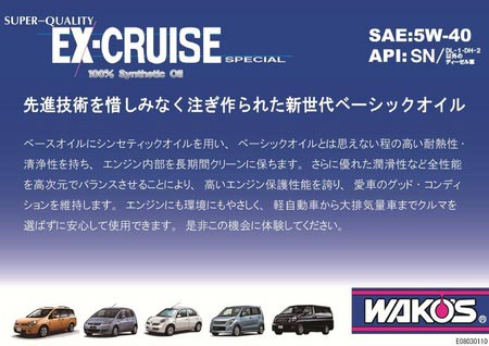 ≪エンジンオイル≫ 「ワコーズ EXクルーズ 5w40 SN」 ポスト エンジンオイルのラインナップが増えました! ワコーズ EXクルーズ 5w40 SNという100%化学合成油のオイルです! この高性能オイルを今回大量仕入れしました。その為お値打ち価格にて好評販売中です! 実際入れてみた感想(L150 ムーヴ 3気筒ターボ)としては燃費もよくなり、 エンジンの音も静かになり個人的に 「GOOD」です! 是非お試しください!! カテゴリ:商品情報 その他メンテナンス