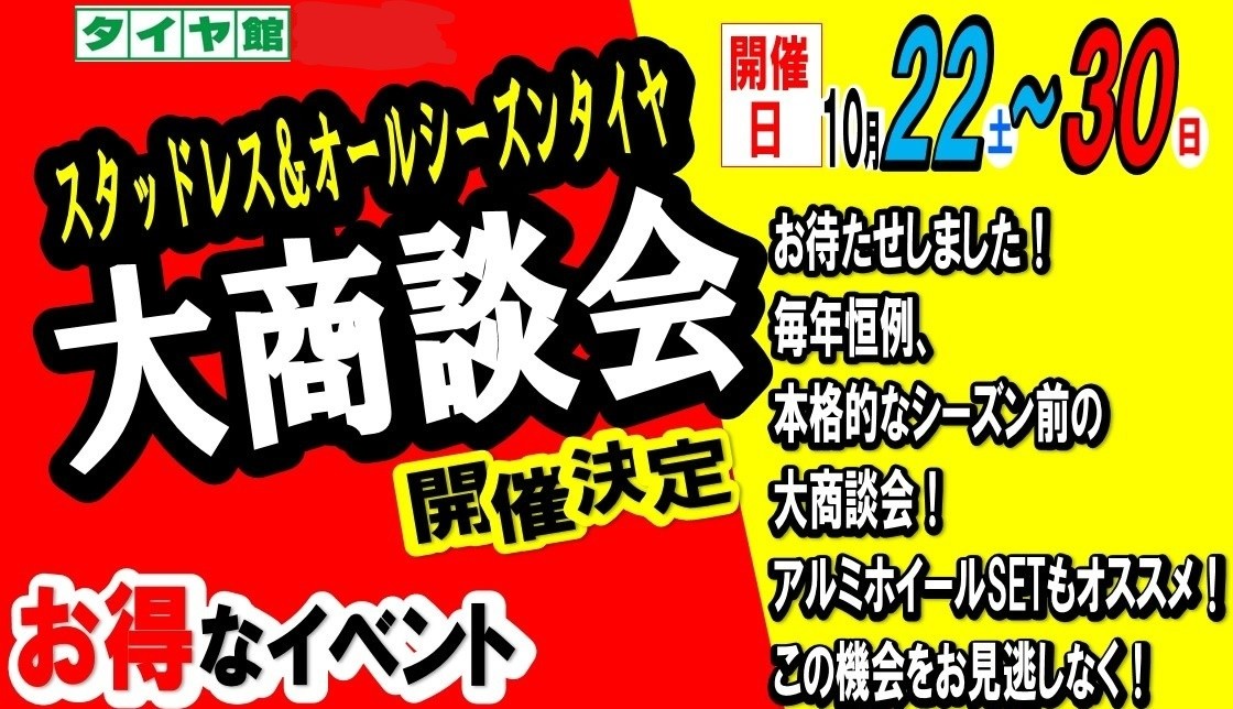 本格シーズン前の【スタッドレス&オールシーズンタイヤ大商談会】 お お待たせしました!毎年恒例の商談会の先行告知です!2022年10月22日(土)~10月30日(日)の間、毎年恒例!本格シーズン前の【スタッドレス&オールシーズンタイヤ大商談会】開催致します!この機会をお見逃しなく!